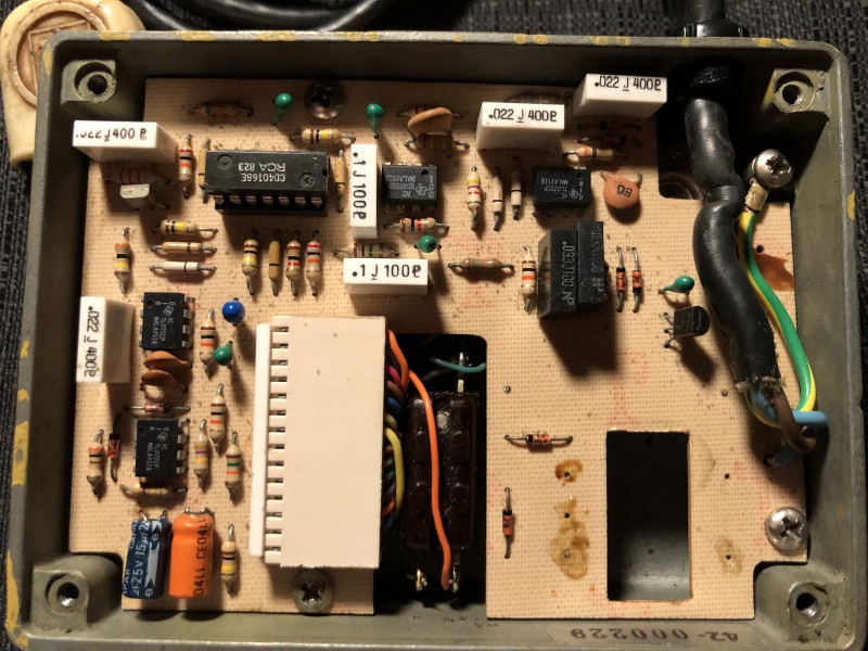 Hello tout le monde, j’ai récupéré il y a peu une pédale de distorsion MXR distortion II des années 80 qui fonctionne sur prise secteur en 110V pour les Usa. L’ancien proprio avait dessoudé le transformateur interne pour le remplacer afin de pouvoir l’alimenter en 220V, mais finalement il ne la jamais remplacé. J’ai donc ressoudé le transfo d’origine et acheté un abaiseur de tension 220V/110V.