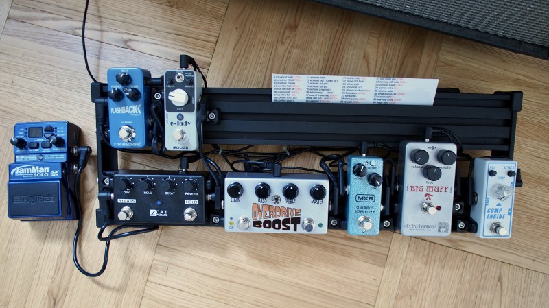 je relance ce sujet passionnant pour vous présenter mon petit Pedalboard inspiré par le maitre , je me suis fait un Pedalboard assez épuré ( le plus épuré possible même ) mais avec l’essentiel pour moi