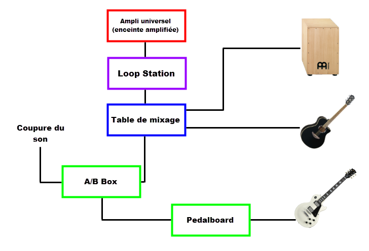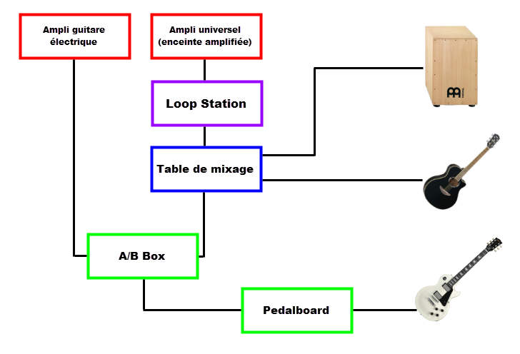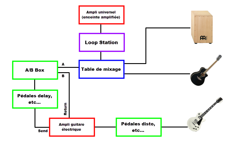 Seulement il m'arrive d'enregistrer des boucles avec ma guitare électrique, du coup il faudrait que je puisse passer ma guitare électrique sur l'autre ampli via ma A/B Box. Facile me direz-vous, je peux facilement appliquer ce schéma :