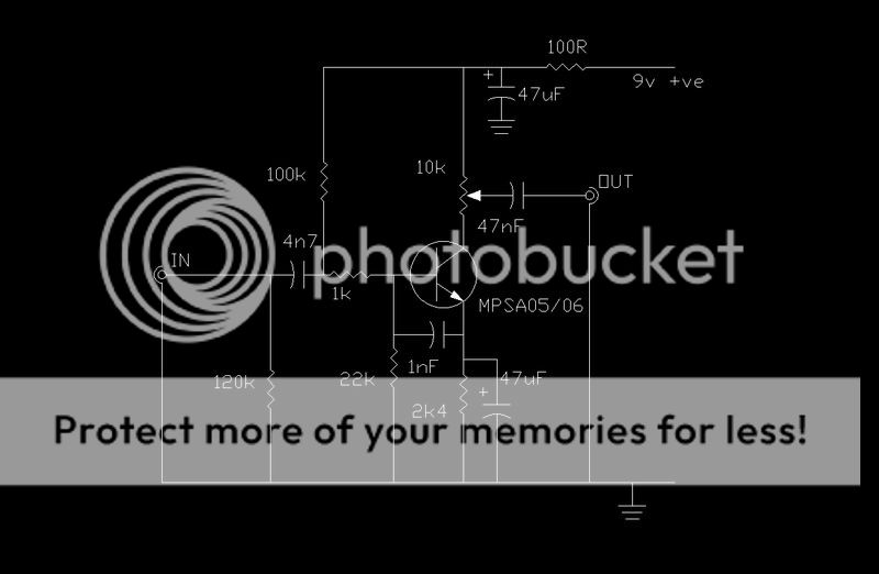 Voici le schéma d'un treble booster (celui qu'utilisait Brian May) simplissime à fabriquer et qui coutera pas bien cher en composants. Le gain est ajustable par un potar de 10k.