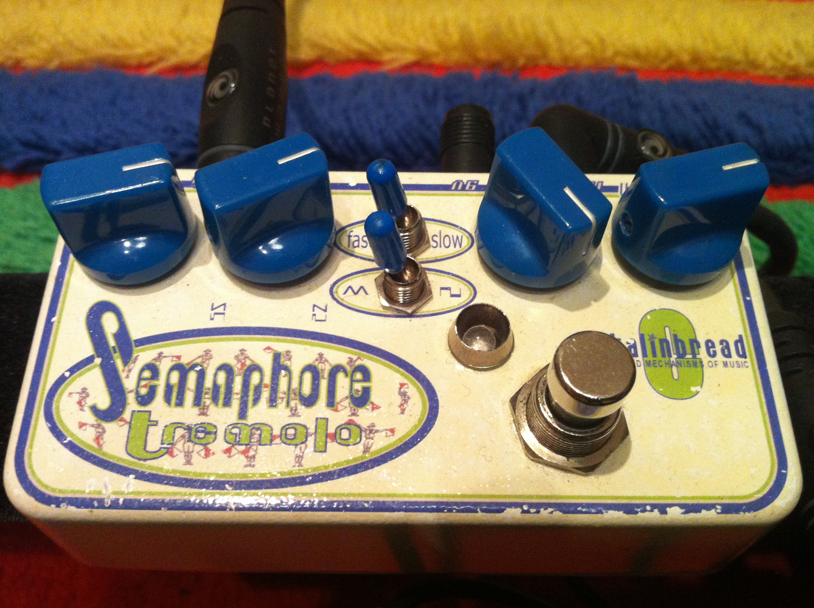 Deux trois mots sur le Semaphore (valables aussi pour le Tremolessence) : toutes les formes d'onde sont possibles, permettant bien plus que l'idée qu'on peut se faire d'un simple tremolo. Tu peux aller d'un effet swell (triangle + rate lent) à une pulsation saccadée rapide genre marteau-piqueur, avec toutes les palettes intermédiaires. Et il y a un potard de volume, qui permet de réellement booster le son si besoin : comme je l'ai indiqué ci-dessus, je fais légèrement cruncher mon ampli en transformant cette pédale en boost, tout effet de tremolo pouvant disparaître avec le réglage qui va bien (consistant juste à tourner un potard à fond sur la gauche - très pratique en live). Et ça dépote.