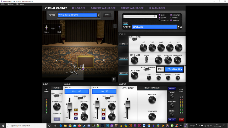 On contrôle cette partie via l'application Torpedo Remote soit par USB branché au PC, soit depuis l'application Smartphone (que je n'ai pas réussi à synchroniser avec mon Captor X pour le moment). J'avais peur d'une chose : mettre plus d'une heure à trouver un preset qui me va bien, voir plus d'une heure pour régler en profondeur la partie simulation de cabinet. Et bien... j'ai du mettre même pas 10 minutes : j'ai regardé un peu les différents cabinets présent avec le produit (on peut en acheter d'autres sur le site de Two Notes, de base, il y a une trentaines de cab', et ça brasse plutôt large), j'ai "vite fait" régler les micros et quelques réglages présent dans Remote et hop j'avais un super son ! En fait, et c'est là où j'ai été bluffé, c'est qu'on est loin des simu' de cab' qu'on peut trouver dans du Amplitube ou Guitar Rig (j'ai littéralement jamais à réussi à obtenir un son satisfaisant dans ce dernier d'ailleurs), ça fait pas trop usine à gaz. On a beau avoir plein de réglage, on est pas vraiment sans cesse en train de tourner des potards virtuels étant donné qu'on arrive à obtenir un bon son facilement, quelque soit le réglage. Alors, je ne sais pas si j'ai vraiment trouvé "LE" preset qui colle avec ce que je V-Twin donne "en vrai", mais en tout cas ça sonnait d'une façon qui m'allait pas mal du tout, et ça correspondait très bien avec le V-Twin. Ça pourrait être chouette d'ailleurs d'avoir un jour une IR de ton V-Twin dans le store de Two Notes, ça ferait matcher 2 firmes Françaises qui ont du talent (et du succès)...