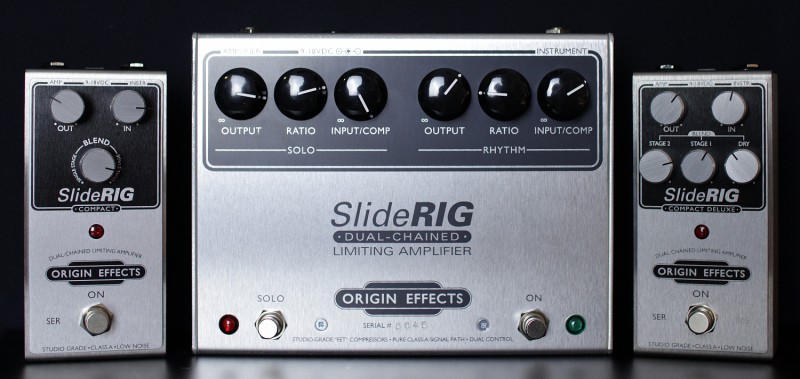 Comme tu le sais déjà, je crois, je joue depuis quelques années avec le SlideRig 1° version (au centre, sur la photo ci-dessous), cette BigBox un peu encombrante, mais très simple à utiliser, avec ses deux étages de compression, chacun pourvu de 3 réglages identiques, un footswitch permettant de passer de l’un à l’autre des étages, à la manière de Lowell George puisque c’est grâce à son exemple et à celui de l’utilisation qu’il faisait de 2 compresseurs Urei que OEffects a créé ce gros SlideRig.