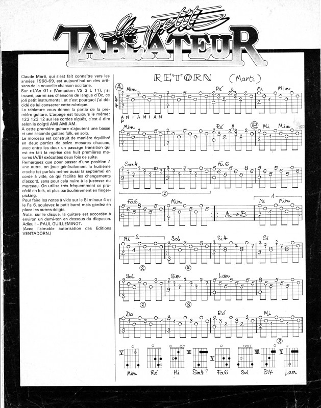 Est-ce quelqu'un par hasard aurait conservé un très très vieux n° de Rock and Folk avec la tablature d'un morceau bien sympa de Claude Marty (si ma mémoire est bonne) : "Retorn" ?