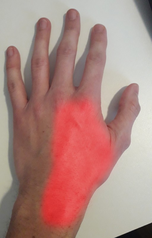 l'ennui c'est qu'à force de faire des exercices en position classique j'ai une douleur qui s'installe à l'arrière de la main (que je ressens aussi un peu à l'avant) dans la zone en rouge que j'ai indiqué sur la photo suivante :