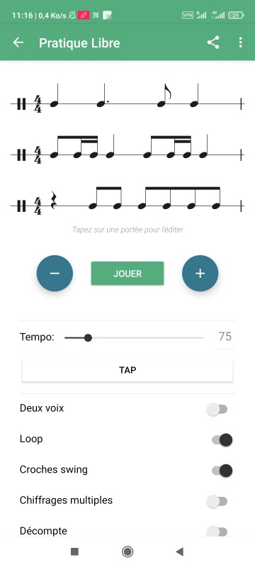 Autre exemple j'ai dans un morceau une première mesure qui fait : noire, noire pointe, croche, noire (donc où le battement peut être à la croche), puis une seconde avec croche, double croche, double croche, noire, croche, double croche, double croche, noire et la mesure 3 : soupire, croches, croche, croche, croche, croche, croche, croche. Rythme en 4/4 (j'ai ajouté à mon second message le rythme en question pour plus de lisibilité)
