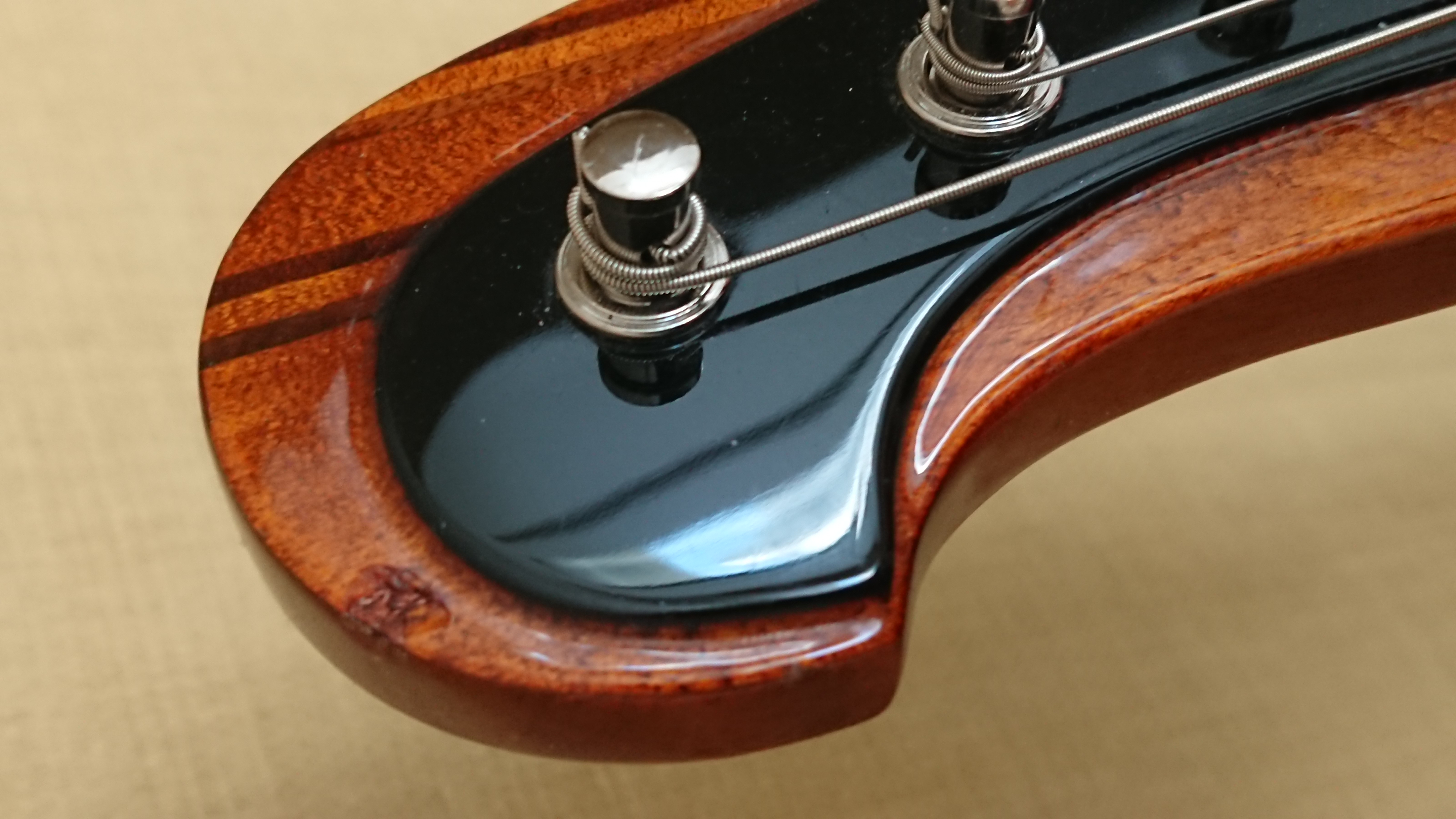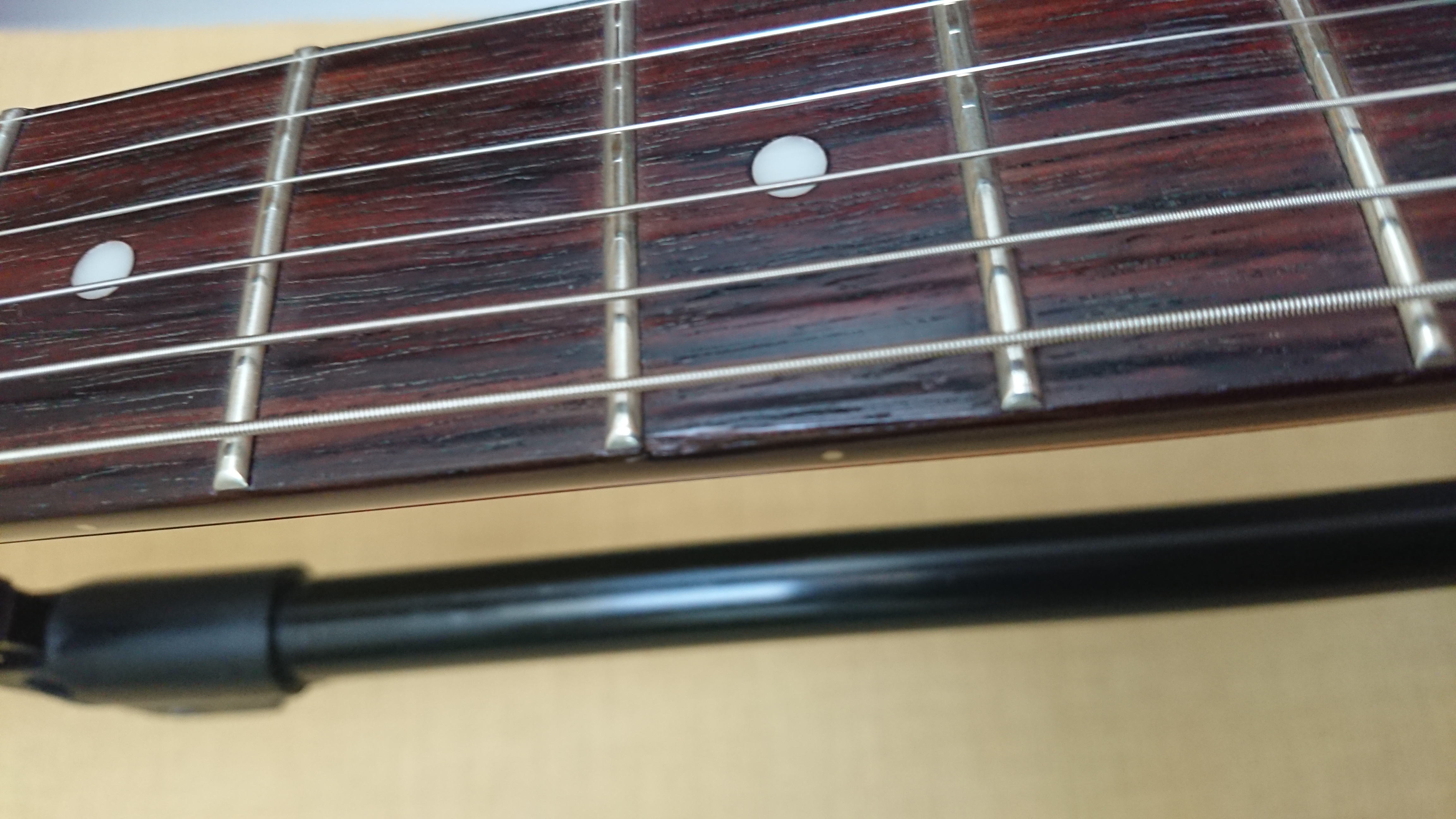 Deux impactes: sur la tête vernis éraflé , sur le bord de touche à la 5em frette (voir photos détails 4 & 5)