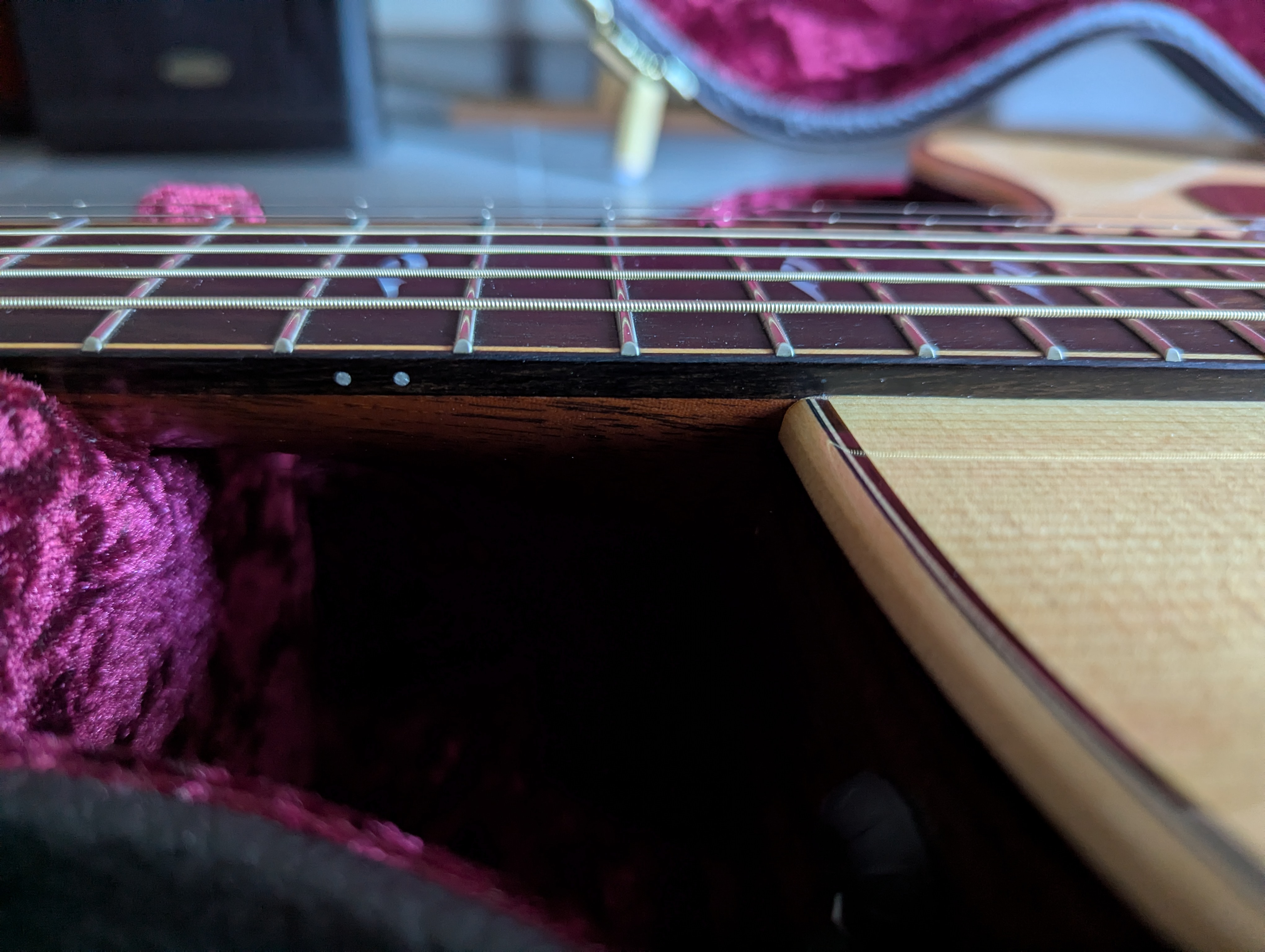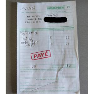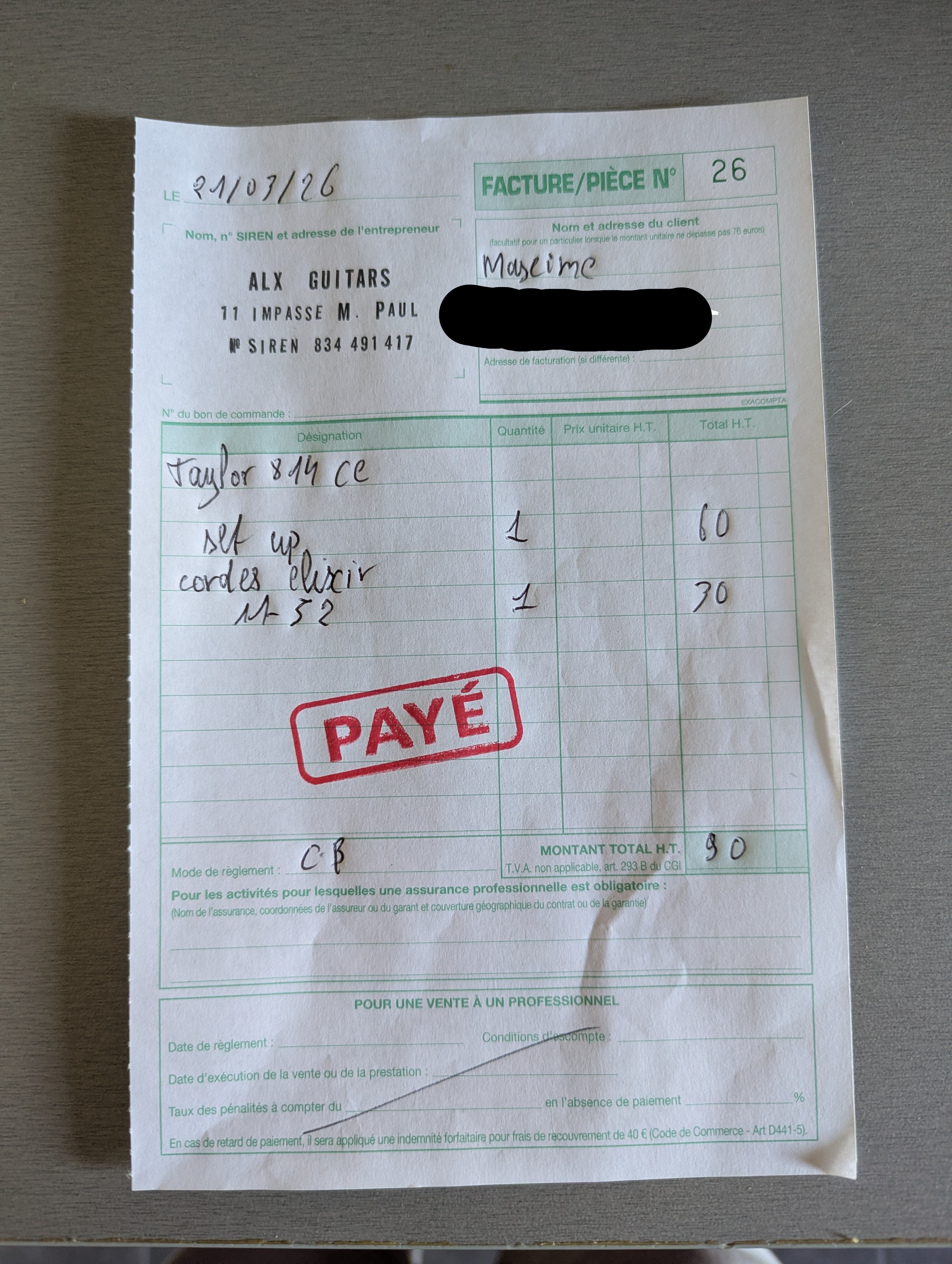 Révision : La guitare sort de chez le luthier ALX Guitar a Tournefeuille (facture en photo avril 2026) : nettoyage et révision complette, pose de cordes neuves (Elixir).